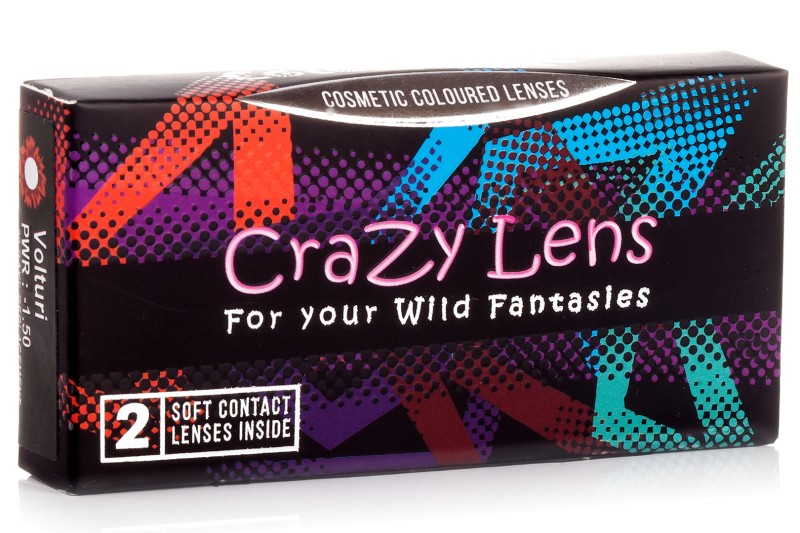 ColourVUE Crazy Lens (2 лещи) – без диоптър. ColourVUE хидрогелови Crazy Lens са създадени със забавни мотиви и придават наистина нестандартна визия на очите. Технологията, с която са произведени, гарантират висока пропускливост на кислород и безопасност, тъй като оцветяването е заключено в най-долните слоеве на лещата. Тези лещи могат да бъдат използвани ежедневно и трябва да бъдат подменяни на всеки 90 дни. Отстраняват се от окото всяка вечер преди лягане и се поставят в разтвор.